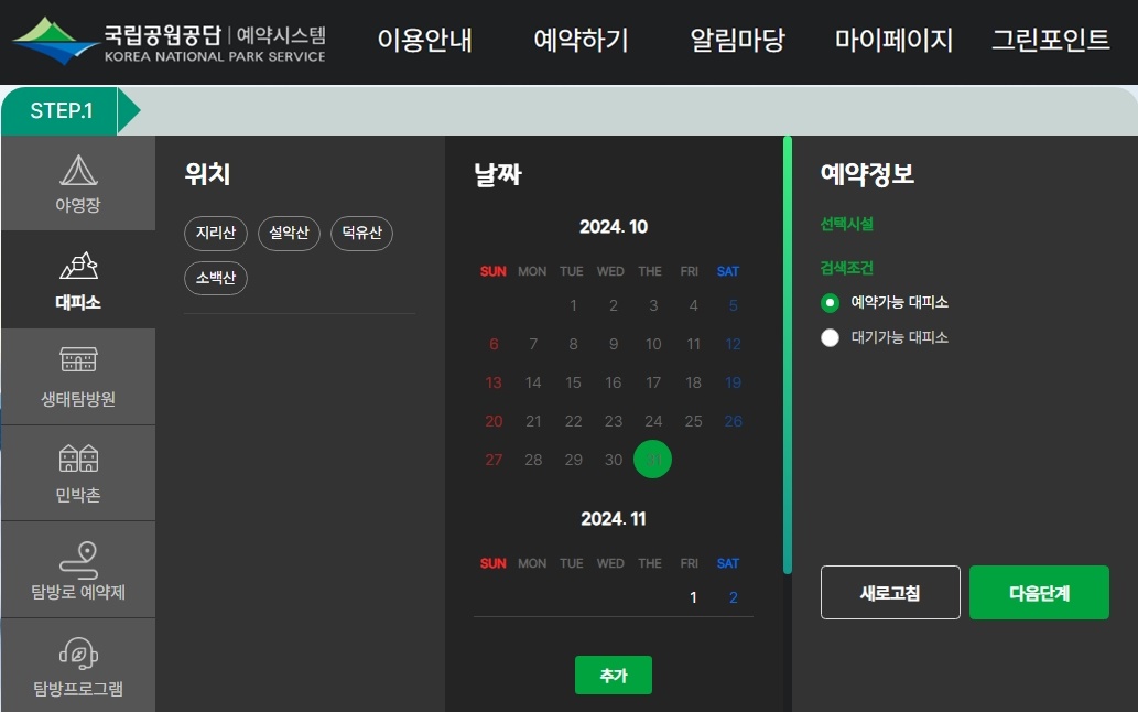 저는 설악산 대피소 예약하려고 아침 9시 정각에 대기했었어요. 들어가자마자 인기 대피소는 몇 초 만에 마감되더라구요. 그래서 예약 전에 미리 위치, 거리, 난이도 등을 조사해 두는 게 좋았어요.